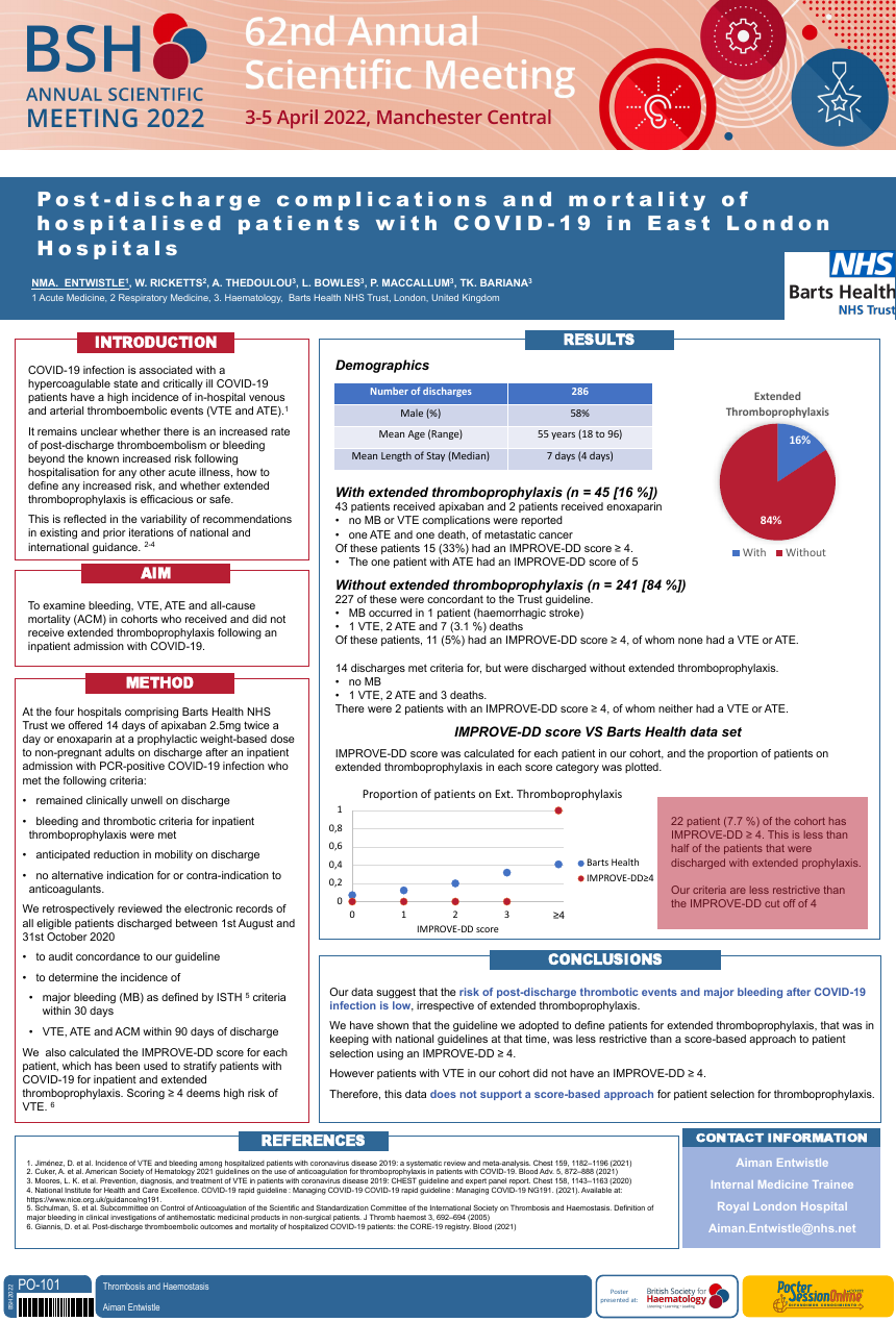 | Postdischarge complications and mortalit.. | Aiman Entwistle .. | W. Ricketts, A. Thedoulou, L. .. | Thrombosis and Haemostasis.. | - - | |