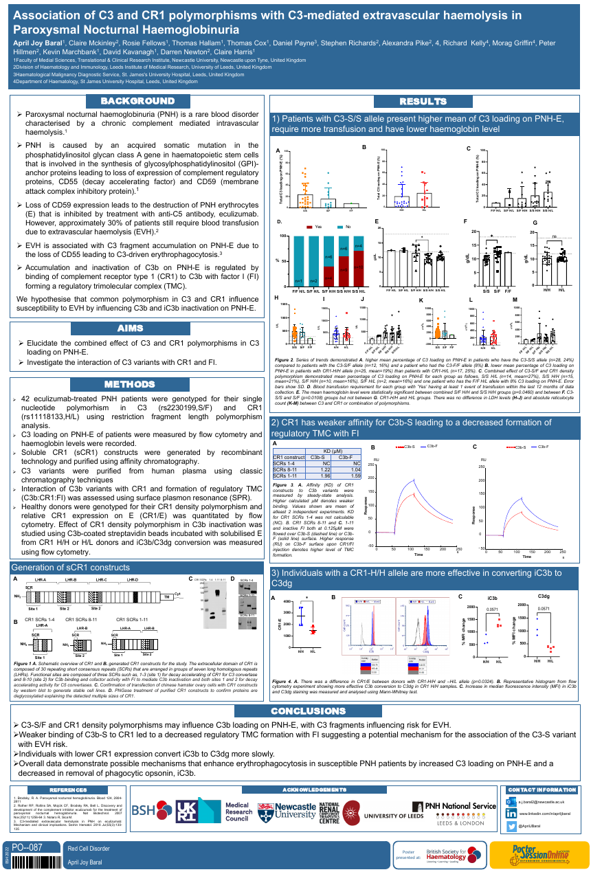 | Association of CR1 and C3 polymorphisms .. | April Joy Baral .. | Claire Mckinley, Rosie Fellows.. | Red Cell Disorder.. | - - | |