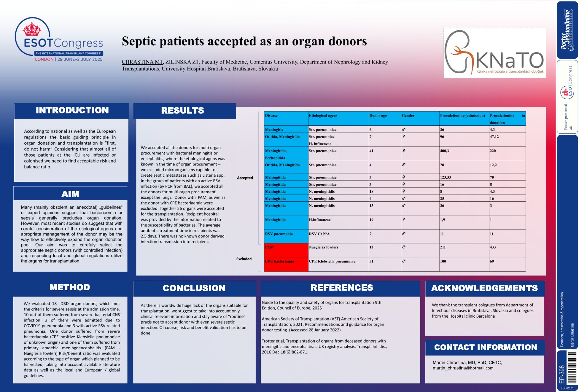 | Septic patients accepted as an organ don.. | Martin Chrastina .. | Zuzana Zilinska.. | Donation, preservation & regeneration.. | - - | |